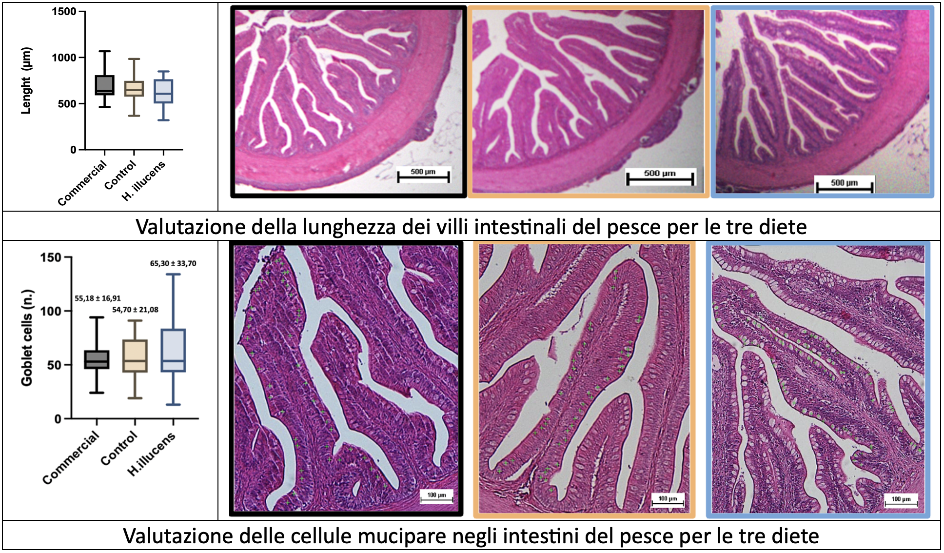 L’inclusione della farina di Hermetia illucens nella dieta di Micropterus salmoides non ha influito sull’organizzazione strutturale e sull’integrità dell’epitelio intestinale, mantenendo invariata la funzionalità della mucosa e la capacità di assorbimento dei nutrienti come si evince da tabelle e immagini sotto riportate: